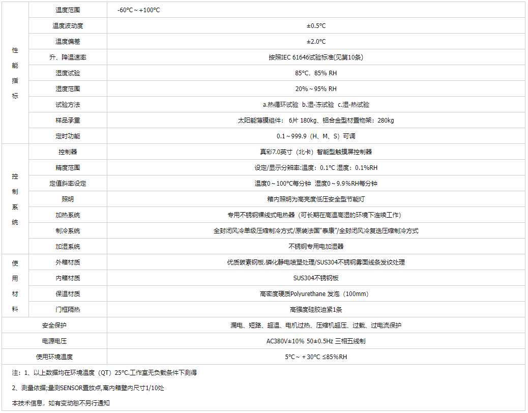 產(chǎn)品簡介:光伏濕凍試驗(yàn)箱適用于光伏組件(太陽能電池板)做熱循環(huán)、濕凍循環(huán)、高溫高濕雙85試驗(yàn),以確認(rèn)組件能否承受高溫高濕之后隨之的負(fù)溫度影響,以及對(duì)于溫度重復(fù)變化時(shí)引起的疲勞和熱失效,另外確定光伏組件曝露在高濕度下而產(chǎn)生的熱應(yīng)力及能夠抵抗?jié)駳忾L期滲透的能力.是光伏組件行業(yè)必不可少的測試設(shè)備。