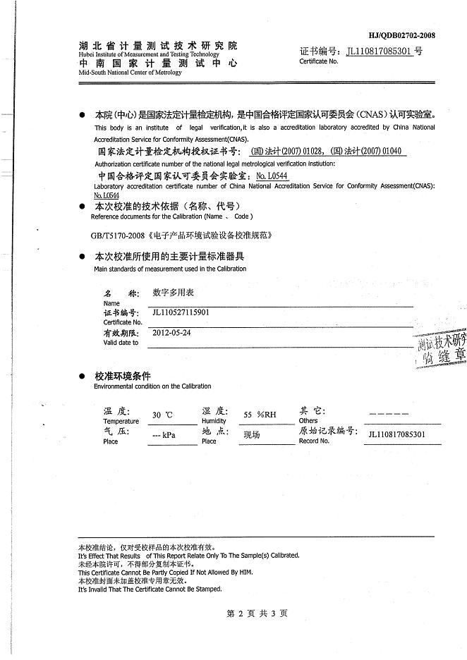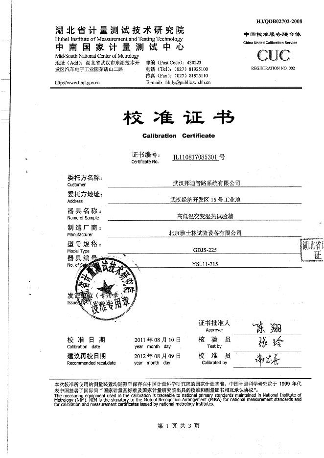 >>高低溫交變濕熱試驗箱校準證書-湖北計量院-武漢邦迪