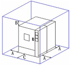 9、高低溫試驗箱周圍應留有適當?shù)氖褂眉熬S護空間,如下圖所示:注:A:不小于60cm B:不小于60cm C: 不小于70cm