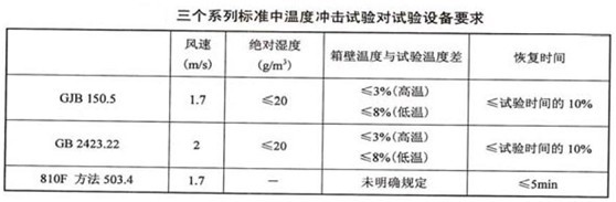 下表中列出了三個系列標準中溫度沖擊試驗對試驗箱的要求,由于都是屬于溫度試驗的范疇,因此其對溫度沖擊試驗箱的要求與溫度試驗箱的要求類似,其主要區別是增加了溫度沖擊試驗中開箱放入試驗樣品后試驗箱內空氣溫度恢復到規定試驗溫度的時間要求。